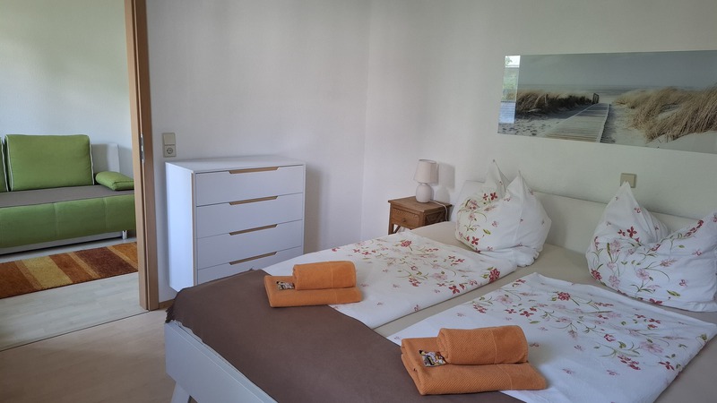 Um für angenehme Träume zu sorgen wurde das separate Schlafzimmer in ruhiger Lage mit einem großen Doppelbett (1,8 x 2,0 m) ausgestattet, sowie sind 2 Nachtschränkchen und ein Kleiderschrank